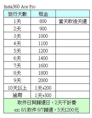 出租商品及報價 Insta360 Ace Pro 首頁 > 商品 > Insta360 Ace Pro > Insta360 Ace Pro 相機出租 Insta360 Ace Pro 相機出租 系統報價已包含取還2天不計費,請於出國前1天取件,回程資料儲存好,隔天再歸還 1.取還日期及地點 取件日 歸還日 數量 取件方式 宅配收送 店取店還 取還地點 台北特約門市(台北 大同區-民權西路) 高雄特約門市(高雄 新興區-八德一路) 行程 請選擇 陸地、雪地旅遊、無下水 玩水、浮潛、海底漫步、體驗潛水15米以內 有執照潛水、超過15米到40米內深潛 2.加租配件 256G記憶卡SanDisk (+20 / 天) 原廠電池 (+30 / 天) 防水殼 (+30 / 天) 漂浮棒+漂浮手環 (+10 / 次) 防霧插片 (+50 / 次) 三向自拍棒 (+10 / 天) 底座貼片- 曲面 (+10 / 次) 底座貼片- 平面 (+10 / 次) 背包夾 (+10 / 天) 手腕帶 (+10 / 天) 頸圈 (+10 / 天) 胸帶(適合滑雪使用) (+10 / 天) 頭帶 (+10 / 天) 原廠迷你腳架 (+20 / 天) 機車夾 (+10 / 天) 萬向蟹夾 (+20 / 天) 三腳吸盤架 (+10 / 天) 防潑水袋 (+10 / 次) 浮潛面罩(小號/女用) (+30 / 天) 防曬水母衣-請備註size (+10 / 天) 蛙鞋-請備註size (+20 / 天) 乾式呼吸管 (+10 / 天) 蛙鏡-請備註度數 (+10 / 天) 3.獨家安心保障(說明頁面) 安心保障 (海底機負擔50%責任損失) +100元/次 4.租金試算 預約天數 2 Insta360 Ace Pro 相機出租 2天 * 1組 = 900 總計 900 加入購物車 Insta360 Ace Pro 運動相機出租 出租標準配件:相機主機/記憶卡128G (U3)/保護套/原廠電池2顆/快拆底座/旅充/座充/傳輸線/讀卡機/92cm防水自拍棒/說明書/收納包 優惠活動:漂浮棒+漂浮手環,加租10/次 參考資料:說明書、錄影及時間、桌機版官方軟體 ※產品適用 : 陸地, 雪地使用 ※若須下水或滑雪,可加租防水殼 ※裝上防水殼,螢幕無法翻轉 ※主機僅能防潑水或雨水,請勿裸機下水 ※加裝防水殼可適用:玩水, 浮潛, 40米內潛水 Insta360 Ace Pro 運動相機- 商品介紹 1/1.3 英吋感光元件+與Leica聯合研發。 PureVideo模式,低光也清晰。 支援4K 120fps影片及4800萬畫素照片。 運動HDR影片,助力獲得生動畫面。 方便的2.4吋可翻轉觸控螢幕。 磁吸快拆鎖扣設計,切換自如。 支援手勢控制/語音控制。 多種易用功能:無損變焦、邊錄邊拍、同檔暫停/續錄、背景傳檔等。 移動縮時、星空模式、定時拍攝…等多樣智慧拍攝模式。 AI Highlight精選助手。 FlowState防震+水平校正。 *以上資訊及圖片示意僅供參考,如有誤植請依官方網站或實際商品為主 參考資料: AcePro_說明書.pdf
