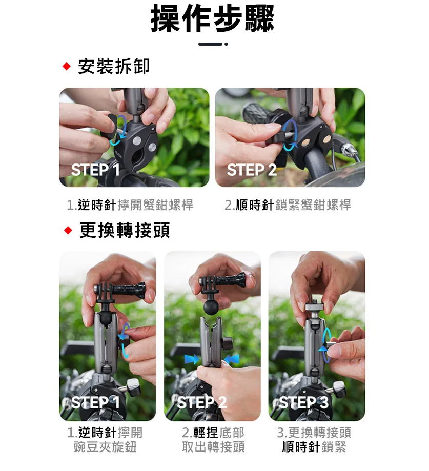 出租商品及報價 GoPro出租 首頁 > 商品 > GoPro出租 > 萬向蟹夾 萬向蟹夾 此商品無單租,需搭配相機出租 1.取還日期及地點 取件日 歸還日 數量 取件方式 店取店還 取還地點 台北特約門市(台北 大同區-民權西路) 台中面交(台中 東區-信義街) 高雄特約門市(高雄 新興區-八德一路) 行程 請選擇 陸地、雪地旅遊、無下水 玩水、浮潛、海底漫步、體驗潛水15米以內 有執照潛水、超過15米到40米內深潛 2.加租配件 此商品尚無配件 3.獨家安心保障(說明頁面) 此商品無提供安心保服務 4.租金試算 預約天數 2 萬向蟹夾 2天 * 1組 = 40 總計 40 加入購物車 萬向蟹夾(只能搭配相機單獨使用) 注意:請勿裝上自拍棒使用(超過承載重量),會造成夾具斷裂 須搭配相機出租,加租20元/ 1天 例如:8/1取件 8/7歸還,5天優惠價100元 商品詳情 TELESIN泰迅 鋁合金 萬向蟹鉗管夾支架 產品特色 ■適用GOPRO/SJCAM/手機 ■鋁合金材質,穩固耐用 ■雙球頭360度旋轉設計 ■防滑膠圈設計,減緩震動 ■可外接自拍桿或延長桿 ■可夾範圍22-38mm